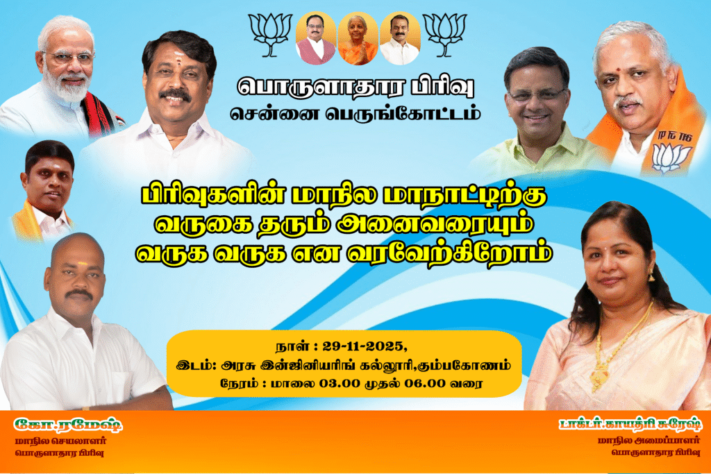 தமிழகத்தில் உள்ள அனைத்து பிரிவுகளின் மாநில மற்றும் மாவட்ட நிர்வாகிகள் அனைவரையும் வருக வருக என பொருளாதார பிரிவின் சார்பாக வரவேற்கிறேன்.